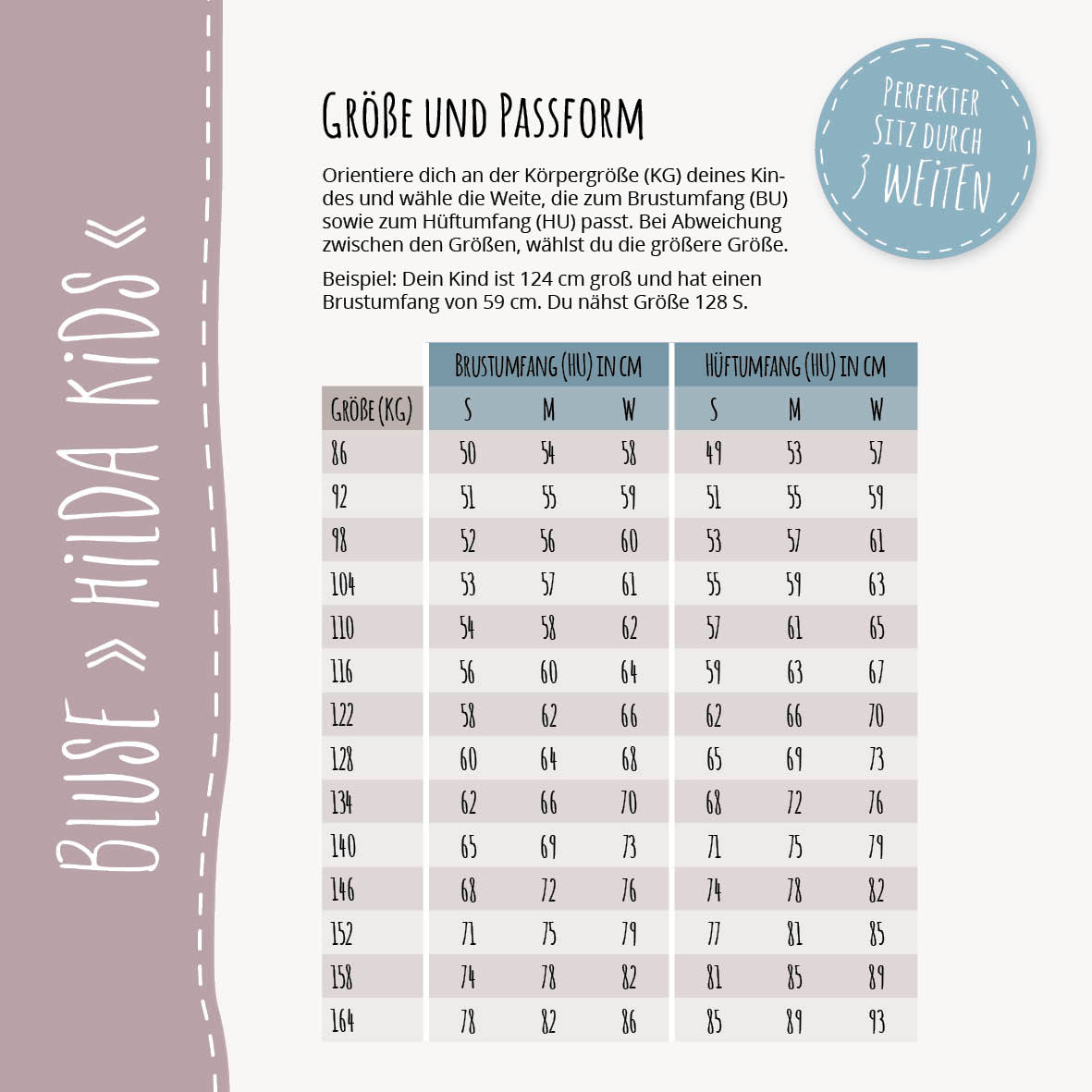 Das Schnittmuster ist in Größe 86–164 erhältlich – jeweils in drei Weiten, damit die Bluse perfekt sitzt, egal ob dein Kind schmal, durchschnittlich oder kräftiger gebaut ist.